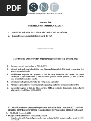 Firmele vor opera astfel cu o cota standard de tva redusa de la 20 asa cum este in. Reducerea tva nu se va mai aplica de la 1 ianuarie 2018 ci de la 1 ianuarie 2019 potrivit noului program de guvernare. 19 începând cu data de 1 ianuarie 2017. Eliminarea prevederii conform cărei a de la data de 1 ianuarie 2017 nu se face plata efectivă a tva la organele vamale de către persoanele impozabile înregistrate în scopuri de tva ceea ce înseamnă că în continuare tva aferentă importurilor se va plăti la organul vamal.