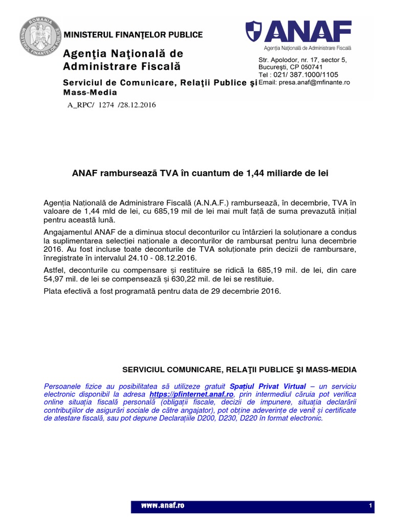 Anaf Ramburseaza Tva In Cuantum De 1 44 Miliarde De Lei A Rpc 1274 28 12 2016